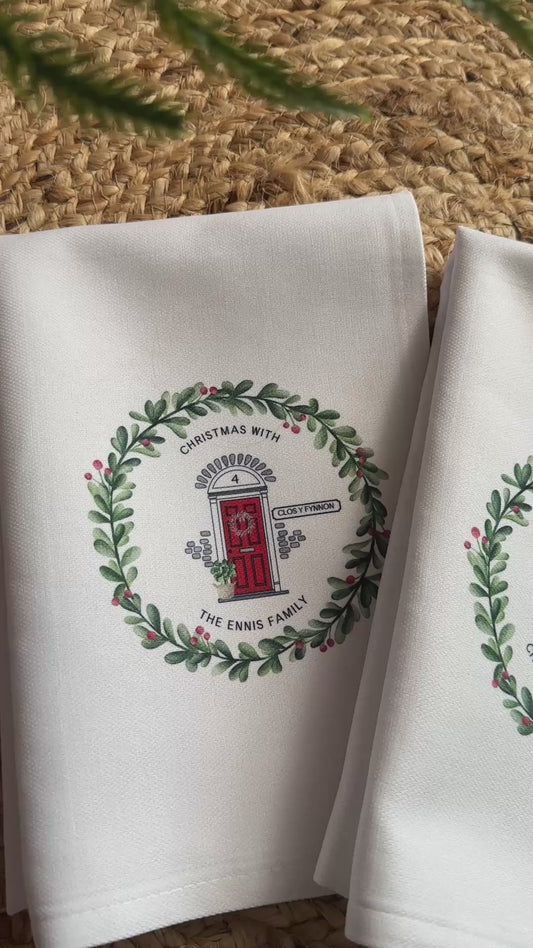 Personalised Christmas Tea Towel; Christmas Front Door with address details